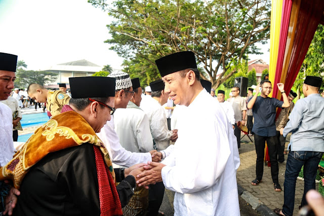Bandar Lampung (Timenews.id) -- Pjs. Gubernur Lampung Didik Suprayitno dan sejumlah pejabat di lingkungan Prmprov Lampung melakukan ibadah Sholat Idul Fitri 1439H/2018 di Lapangan Korem 043/Gatam Enggal Bandar Lampung, Jumat (15/6/2018). Pada solad ied tersebut, bertindak selaku khotib Rektor UIN Raden Intan Lampung, Prof. Dr. H. Moh. Mukri, M.Ag dengan tema khutbah: "Idul Fitri: Momentum Menebar Islam Rahmatan Lil'Alamin." Sedangkan imam yakni H. Hasbuna.
